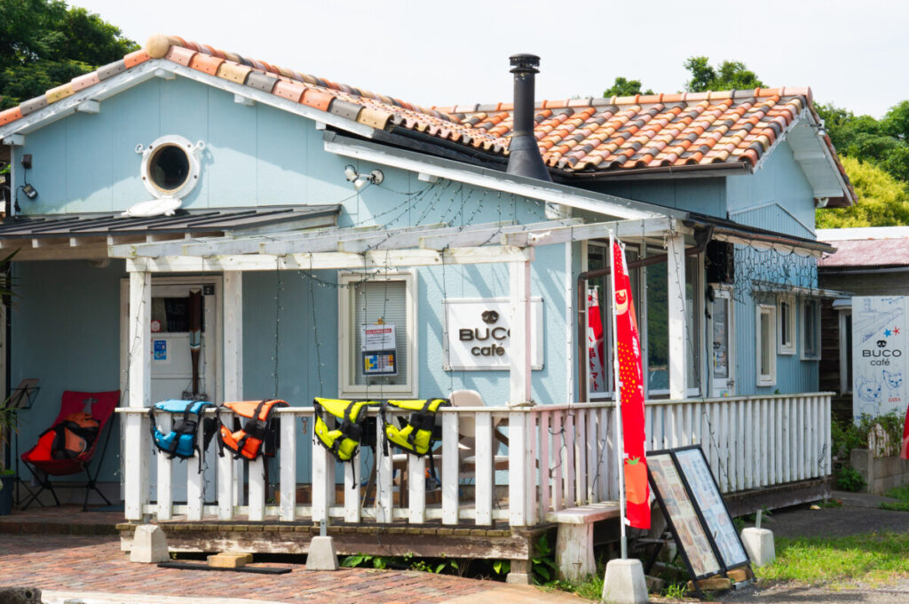 川棚町・三越郷。国道から片島公園(川棚魚雷発車試験場跡)へ向かう方向に曲がり、海沿いまで下ったところにあるカフェ。